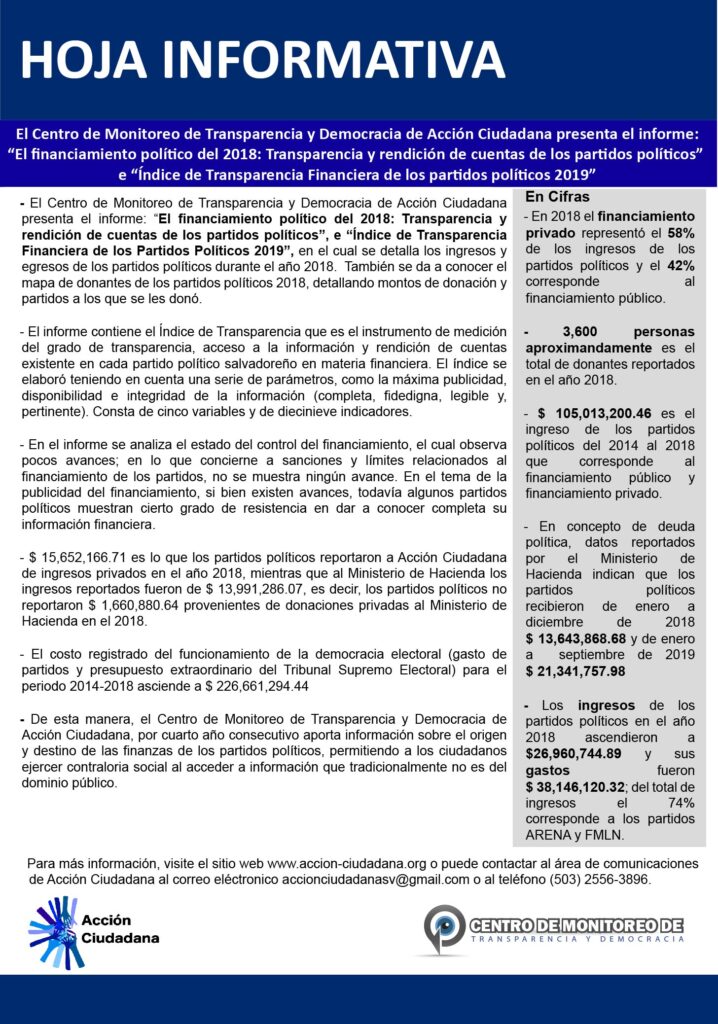 Por cuarto año consecutivo Acción Ciudadana, por medio del Centro de Monitoreo de Transparencia y Democracia, presenta un informe descriptivo y evaluativo del sistema de financiamiento de la política en El Salvador, en este caso, correspondiente al año 2018.