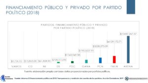 Los datos del informe expresan que en el período 2014-2018 el partido ARENA concentra el 55% ($57,400,664.22) del financiamiento total