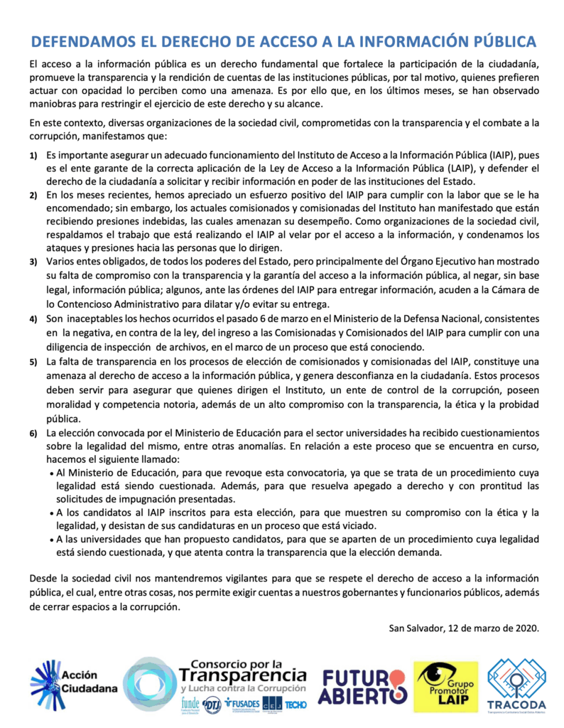 Acción Ciudadana, en coordinación con el Consorcio por la Transparencia y Lucha Contra la Corrupción (FUNDE, DTJ, FUSADES, CEJ, TECHO), Futuro Abierto, Grupo Promotor LAIP y TRACODA, realizaron una conferencia de prensa el jueves 12 de marzo en el cual brindaron su posicionamiento respecto a la importancia del adecuado funcionamiento del Instituto de Acceso a la Información Pública (IAIP)