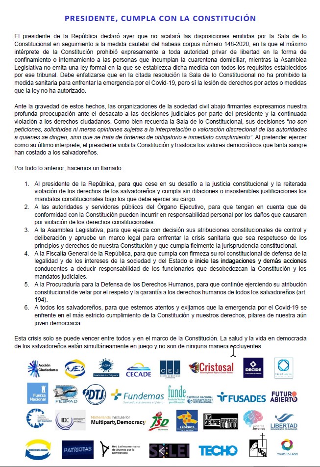 Ante la gravedad de estos hechos, las organizaciones de la sociedad civil abajo firmantes expresamos nuestra profunda preocupación ante el desacato a las decisiones judiciales por parte del presidente y la continuada violación a los derechos ciudadanos. Como bien recuerda la Sala de lo Constitucional, sus decisiones “no son peticiones, solicitudes ni meras opiniones sujetas a la interpretación o valoración discrecional de las autoridades a quienes se dirigen, sino que se trata de órdenes de obligatorio e inmediato cumplimiento”. Al pretender ejercer como su último interprete, el presidente viola la Constitución y trastoca los valores democráticos que tanta sangre han costado a los salvadoreños.