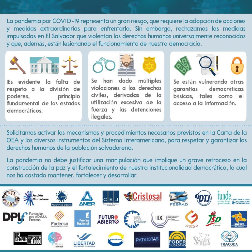 En la carta, las organizaciones de la sociedad civil consideran que las medidas impulsadas en El Salvador para combatir la pandemia no justifica una manipulación que implique un grave retroceso en la construcción de la paz y el fortalecimiento de la institucionalidad democrática del país, la cual, ha costado mantener, fortalecer y desarrollar.
