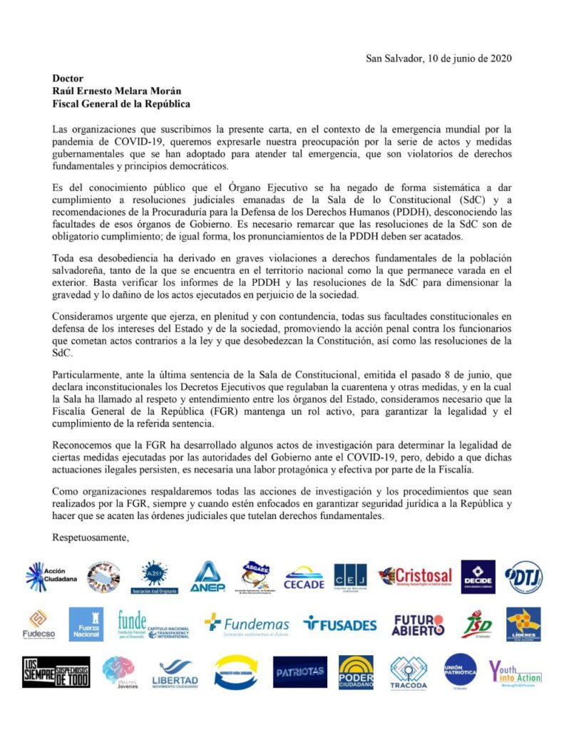 Particularmente, ante la última sentencia de la Sala de Constitucional, emitida el pasado 8 de junio, que declara inconstitucionales los Decretos Ejecutivos que regulaban la cuarentena y otras medidas, y en la cual la Sala ha llamado al respeto y entendimiento entre los órganos del Estado, consideramos necesario que la Fiscalía General de la República (FGR) mantenga un rol activo, para garantizar la legalidad y el cumplimiento de la referida sentencia.