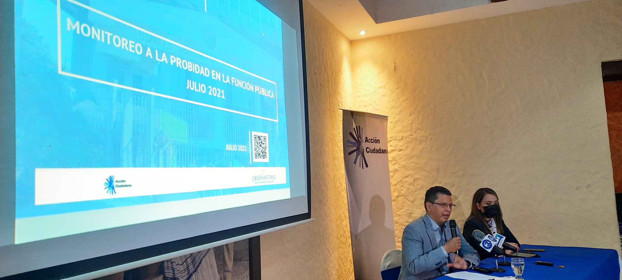 Acción Ciudadana, por medio del Observatorio para el Fortalecimiento Institucional, dando continuidad al monitoreo de la transparencia en la gestión pública como un elemento de prevenir la corrupción, presentó el jueves 22 de julio de 2021 el informe: “Monitoreo a la probidad en la función pública. Periodo: Diciembre 2020 – julio 2021”.