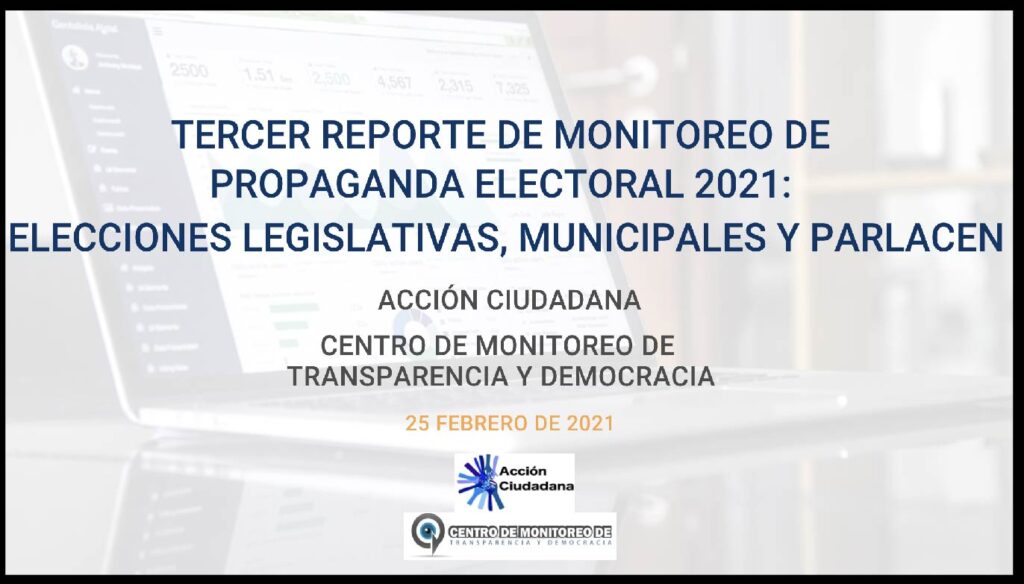 25 de febrero de 2021 Acción Ciudadana, por medio su Centro de Monitoreo de Transparencia y Democracia, presentó el jueves 25 de febrero de 2021 los resultados del tercer reporte del monitoreo a la propaganda electoral de las elecciones municipales, legislativas y del Parlamento Centroamericano 2021. En datos: Del 27 de noviembre de 2020 al […]